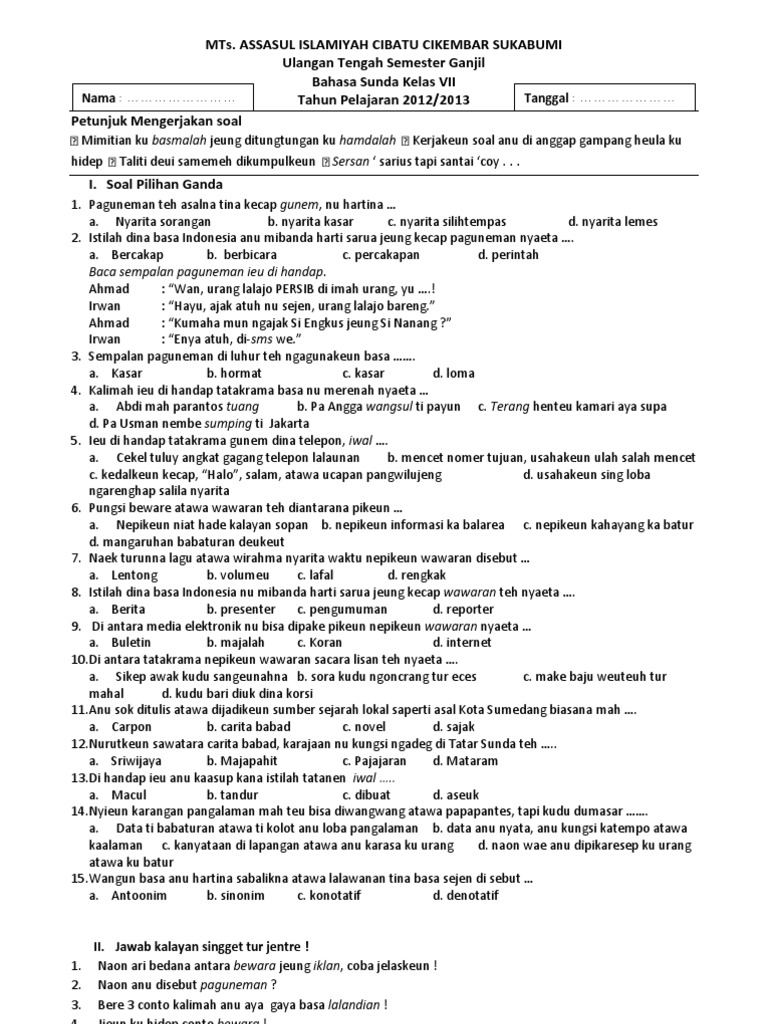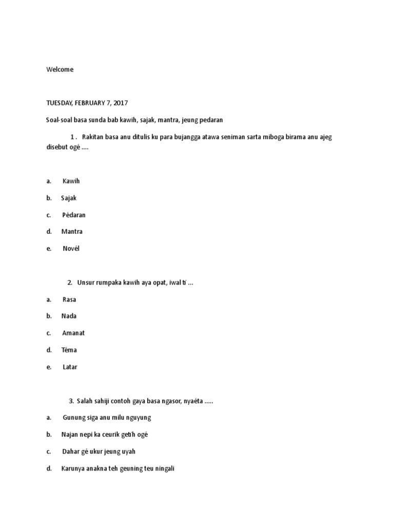 Kartu Soal Bahasa Sunda from imgv2-2-f.scribdassets.com Gaya basa rautan teh naon. Gaya basa nya éta corak éksprési basa boh dina prosa boh puisi, atawa cara kumaha ku pangarang dina ngagunakeun omongan (iskandarwassid, 2003: Téoh (dialek kuningan)= handap ompod(dialek bogor)= sieunan, borangan 2. Oct 20, 2020 · ari dina jaman walanda, naon ngaranna eta gedong teh? Apr 29, 2012 · 13. Jentrekeun ngenaan wirahma dina maca sajak! Ieu di handap dijéntrékeun saperluna. Naon bedana sejak jeung guguritan?
